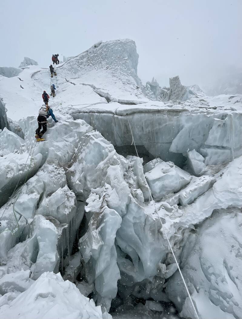 The Khumbu Icefall is located at the head of the Khumbu Glacier and the foot of the Western Cwm and sits at the head of base camp and southwest of the summit. The icefall is considered one of the most dangerous stages of the South Col route to Everest summit. The Khumbu Glacier moves around 1.2m per day, hence it’s a constant changing landscape and creaks and groans as it moves - a menacing tune we sit and listen to in base camp. Due to this movement snow bridges concealing crevasses and overhanging ice blocks (called seracs) ranging in size from several tons to thousands of tons, can open or collapse with little warning generating extreme danger for climbers. A climber caught in an avalanche or other ‘movement event’ in the icefall can do very little to avoid injury or death. Professional ‘ice doctors’ pick the route each season and set the ropes and ladders to cross through the icefall but even their expertise cannot prevent a loss of life. Records suggest 45 people have lost their life in the Khumbu Icefall since 1953.