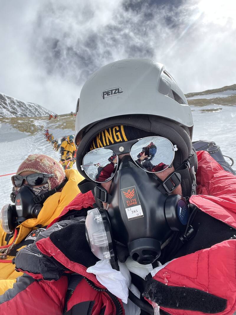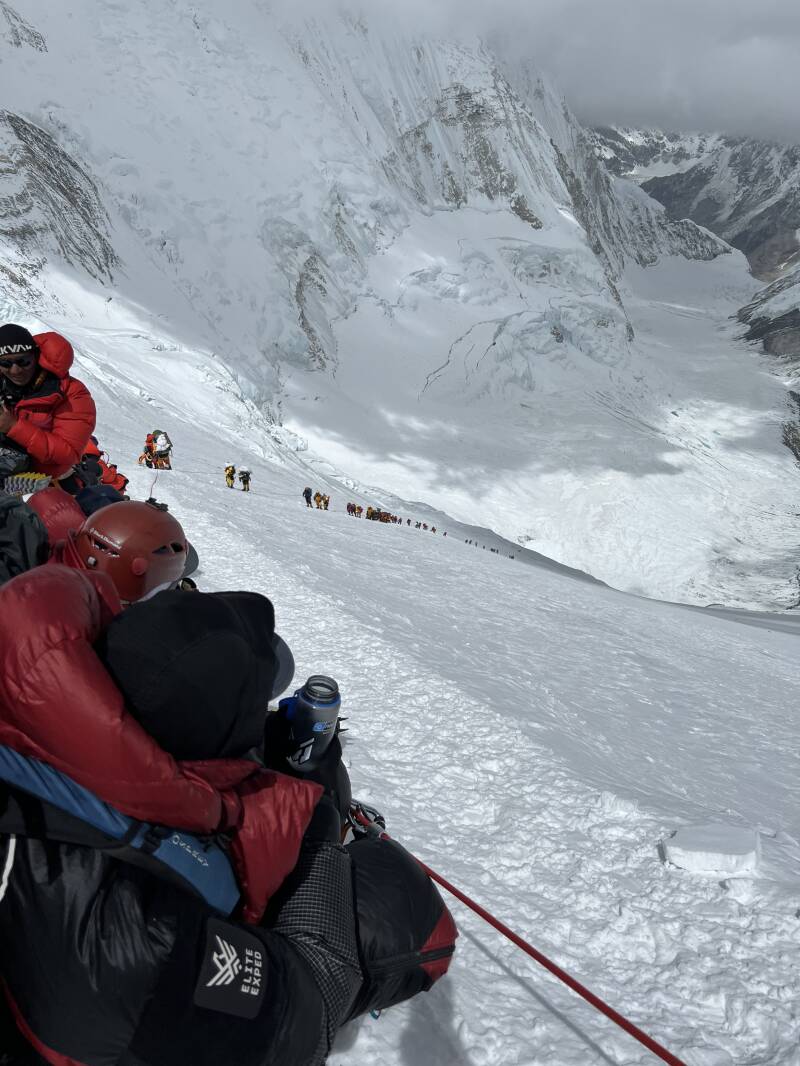 Summitting at around 6am on the highest point on the planet was an amazing experience, so overwhelming after such a feat of endurance to reach it that it was hard to take in but one thing I knew for certain that hadn’t escaped my mind was that getting to that point was only half way and key to this being a successful expedition was making sure I got back down in one piece. We spent maybe 20 to 30 minutes on the summit taking our photos, looking at the views and chatting with fellow climbers before it was time to leave and as I gather my belongings and untangled my feet from the prayer flags I could see not far away coming up the final slope towards the summit a steady queue of climbers all eager to get their photos and do the same.